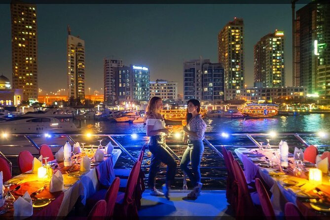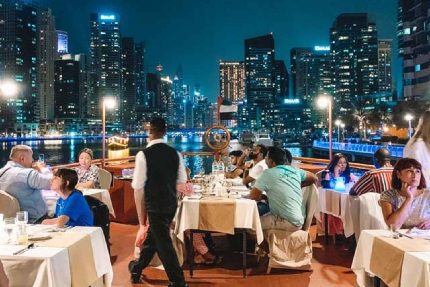 This isn’t just dinner on a boat—it’s a front-row seat to Dubai’s timeless skyline. Watch as the city lights reflect off the water, blending the charm of old Dubai with the glamour of its modern landmarks. As you cruise, enjoy live music and the mesmerizing Tanura dance show—a traditional spinning performance that adds rhythm and culture to your evening.