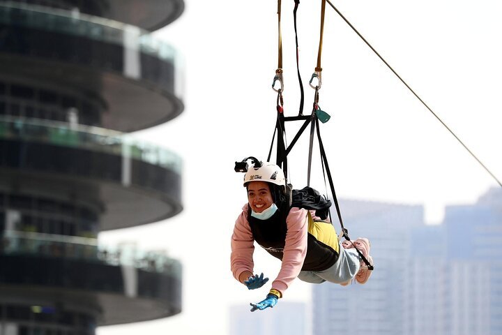 - Starting from Amwaj Tower at 170 meters high, you’ll zip down a 1-kilometer-long ride across Dubai Marina. As you soar head-first in a belly-down position, you’ll enjoy stunning aerial views of Dubai’s luxury yachts, the Ain Dubai observation wheel, and the iconic landmarks of the marina.